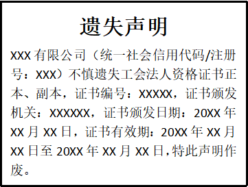 XXX有限公司(統(tǒng)一社會(huì)信用代碼/注冊(cè)號(hào):XXX)不慎遺失工會(huì)法人資格證書正本、副本,證書編號(hào):XXXXX,證書頒發(fā)機(jī)關(guān):XXXXXX,證書頒發(fā)日期:20XX年XX月XX日,證書有效期:20XX年XX月XX日至20XX年XX月XX日,特此聲明作廢。