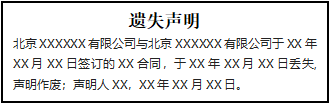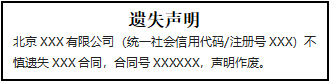 北京XXX有限公司(統(tǒng)一社會(huì)信用代碼/注冊(cè)號(hào)XXX)不慎遺失XXX合同,合同號(hào)XXXXXX,聲明作廢。
