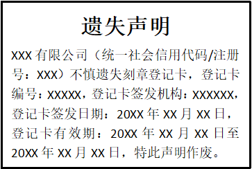 XXX有限公司(統(tǒng)一社會(huì)信用代碼/注冊(cè)號(hào):XXX)不慎遺失刻章登記卡,登記卡編號(hào):XXXXX,登記卡簽發(fā)機(jī)構(gòu):XXXXXX,登記卡簽發(fā)日期:20XX年XX月XX日,登記卡有效期:20XX年XX月XX日至20XX年XX月XX日,特此聲明作廢。