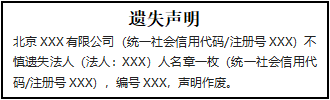 北京XXX有限公司(統(tǒng)一社會(huì)信用代碼/注冊(cè)號(hào)XXX)不慎遺失法人(法人:XXX)人名章一枚(統(tǒng)一社會(huì)信用代碼/注冊(cè)號(hào)XXX),編號(hào)XXX,聲明作廢。