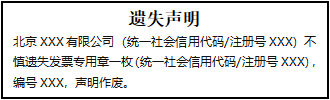 北京XXX有限公司(統(tǒng)一社會(huì)信用代碼/注冊號XXX)不慎遺失發(fā)票專用章一枚(統(tǒng)一社會(huì)信用代碼/注冊號XXX),編號XXX,聲明作廢。