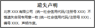 北京XXX有限公司(統(tǒng)一社會信用代碼/注冊號XXX)不慎遺失合同專用章一枚(統(tǒng)一社會信用代碼/注冊號XXX),編號XXX,聲明作廢。