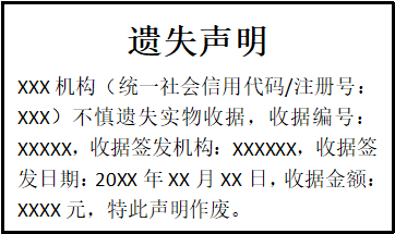 XXX機(jī)構(gòu)(統(tǒng)一社會(huì)信用代碼/注冊(cè)號(hào):XXX)不慎遺失實(shí)物收據(jù),收據(jù)編號(hào):XXXXX,收據(jù)簽發(fā)機(jī)構(gòu):XXXXXX,收據(jù)簽發(fā)日期:20XX年XX月XX日,收據(jù)金額:XXXX元,特此聲明作廢。