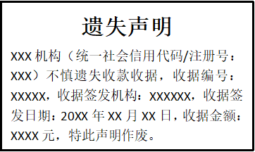 XXX機(jī)構(gòu)(統(tǒng)一社會信用代碼/注冊號:XXX)不慎遺失收款收據(jù),收據(jù)編號:XXXXX,收據(jù)簽發(fā)機(jī)構(gòu):XXXXXX,收據(jù)簽發(fā)日期:20XX年XX月XX日,收據(jù)金額:XXXX元,特此聲明作廢。