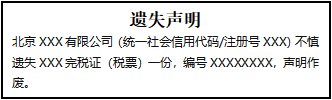 北京XXX有限公司(統(tǒng)一社會信用代碼/注冊號XXX)不慎遺失XXX完稅證(稅票)一份,編號XXXXXXXX,聲明作廢。