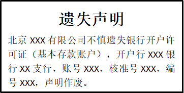 北京XXX有限公司不慎遺失銀行開戶許可證(基本存款賬戶),開戶行XXX銀行XX支行,賬號XXX,核準(zhǔn)號XXX,編號XXX,聲明作廢。