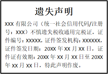 XXX有限公司(統(tǒng)一社會信用代碼/注冊號:XXX)不慎遺失稅收通用完稅證,證件編號:XXXXX,證件簽發(fā)機構:XXXXXX,證件簽發(fā)日期:20XX年XX月XX日,證件證有效期:20XX年XX月XX日至20XX年XX月XX日,特此聲明作廢。