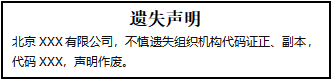 XXX有限公司(統(tǒng)一社會信用代碼/注冊號:XXX)不慎遺失組織機構(gòu)代碼證正本、副本,,證件編號:XXXXX,證件頒發(fā)機關(guān):XXXXXX,證件頒發(fā)日期:20XX年XX月XX日,證件有效期:20XX年XX月XX日至20XX年XX月XX日,特此聲明作廢。