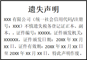 XXX有限公司(統(tǒng)一社會(huì)信用代碼/注冊(cè)號(hào):XXX)不慎遺失稅務(wù)登記證正本、副本,,證件編號(hào):XXXXX,證件頒發(fā)機(jī)關(guān):XXXXXX,證件頒發(fā)日期:20XX年XX月XX日,證件有效期:20XX年XX月XX日至20XX年XX月XX日,特此聲明作廢。