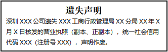 深圳XXX公司遺失XXX工商行政管理局XX分局XX年X月X日核發(fā)的營業(yè)執(zhí)照(副本、正副本),統(tǒng)一社會信用代碼XXX(注冊號XXX),聲明作廢。