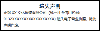 無錫XX文化傳媒有限公司(統(tǒng)一社會信用代碼:9132XXXXXXXXXXXXXXXXXX)遺失電子營業(yè)執(zhí)照,特此聲明作廢。