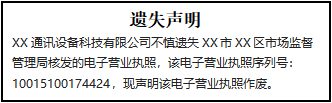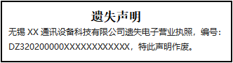 無錫XX通訊設(shè)備科技有限公司遺失電子營業(yè)執(zhí)照,編號:DZ320200000XXXXXXXXXXXX,特此聲明作廢。