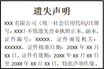 XXX有限公司(統(tǒng)一社會信用代碼/注冊號:XXX)不慎遺失營業(yè)執(zhí)照正本、副本,證件編號:XXXXX,證件頒發(fā)機關(guān):XXXXXX,證件核準(zhǔn)日期:20XX年XX月XX日,證件有效期:20XX年XX月XX日至20XX年XX月XX日,特此聲明作廢。