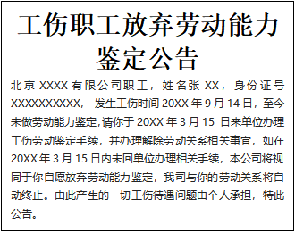 工傷職工放棄勞動(dòng)能力鑒定公告