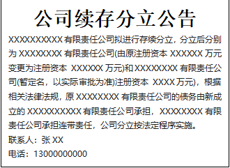XXXXXXXXXX有限責(zé)任公司擬進(jìn)行存續(xù)分立,分立后分別為XXXXXXXX有限責(zé)任公司(由原注冊資本XXXXXX萬元變更為注冊資本 XXXXXX萬元)和XXXXXXXX有限責(zé)任公司(暫定名,以實(shí)際審批為準(zhǔn))注冊資本 XXXX萬元),根據(jù)相關(guān)法律法規(guī),原XXXXXXXX有限責(zé)任公司的債務(wù)由新成立的XXXXXXXXXX有限責(zé)任公司承擔(dān),XXXXXXXX有限責(zé)任公司承擔(dān)連帶責(zé)任,公司分立按法定程序?qū)嵤?/div>