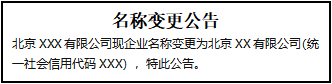 北京XXX有限公司現企業(yè)名稱變更為北京XX有限公司(統一社會信用代碼XXX),特此公告。