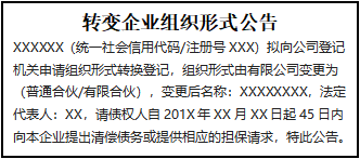 XXXXXX(統(tǒng)一社會信用代碼/注冊號XXX)擬向公司登記機關(guān)申請組織形式轉(zhuǎn)換登記,組織形式由有限公司變更為(普通合伙/有限合伙),變更后名稱:XXXXXXXX,法定代表人:XX,請債權(quán)人自201X年XX月XX日起45日內(nèi)向本企業(yè)提出清償債務(wù)或提供相應(yīng)的擔保請求,特此公告。