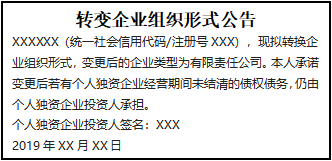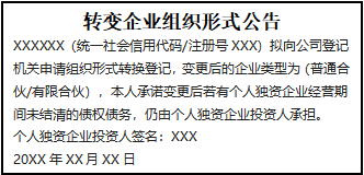 個人獨資企業(yè)轉(zhuǎn)變企業(yè)組織形式公告