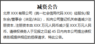 減資公告:北京XXX有限公司(統(tǒng)一社會(huì)信用代碼XXX)經(jīng)股東/股東會(huì)/董事會(huì)(決定/決議),擬向公司登記機(jī)關(guān)申請(qǐng)減少注冊(cè)資本,注冊(cè)資本由XXX萬(wàn)元人民幣減少至XXX萬(wàn)元人民幣,請(qǐng)債權(quán)債務(wù)人于見報(bào)之日起45日內(nèi)向本公司提出債權(quán)債務(wù)或提供相應(yīng)的擔(dān)保請(qǐng)求,特此公告。
