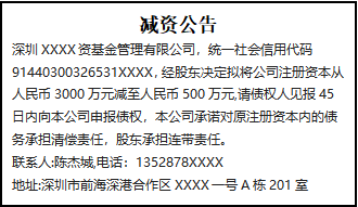 減資公告:深圳XXXX資基金管理有限公司,統(tǒng)一社會(huì)信用代碼91440300326531XXXX,經(jīng)股東決定擬將公司注冊(cè)資本從人民幣3000萬(wàn)元減至人民幣500萬(wàn)元,請(qǐng)債權(quán)人見報(bào)45日內(nèi)向本公司申報(bào)債權(quán),本公司承諾對(duì)原注冊(cè)資本內(nèi)的債務(wù)承擔(dān)清償責(zé)任,股東承擔(dān)連帶責(zé)任。