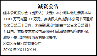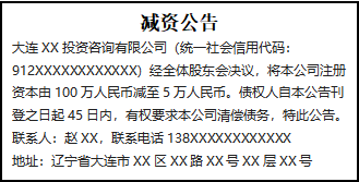 減資公告:大連XX投資咨詢有限公司(統(tǒng)一社會(huì)信用代碼:912XXXXXXXXXXXX)經(jīng)全體股東會(huì)決議,將本公司注冊(cè)資本由100萬(wàn)人民幣減至5萬(wàn)人民幣。債權(quán)人自本公告刊登之日起45日內(nèi),有權(quán)要求本公司清償債務(wù),特此公告。