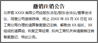 北京苞XXXX有限公司經(jīng)股東決定/股東會(huì)決議/董事會(huì)決議,同意公司繼續(xù)存續(xù)、終止20XX年XX月XX日在XX工商分局辦理的清算備案登記注銷,解散由XX組長(zhǎng)、XX組成的清算組,恢復(fù)正常經(jīng)營(yíng),擬向工商機(jī)關(guān)申請(qǐng)撤銷注銷備案登記,特此公告。