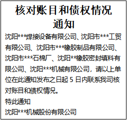 沈陽***焊接設(shè)備有限公司、沈陽市***工貿(mào)有限公司、沈陽市***橡膠制品有限公司、沈陽市***石棉廠、沈陽**橡膠密封填料有限公司、沈陽***機(jī)械有限公司,請以上單位在此通知發(fā)布之日起5日內(nèi)聯(lián)系我司核對賬目和債權(quán)情況。