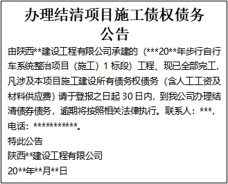 由陜西**建設(shè)工程有限公司承建的(***20**年步行自行車系統(tǒng)整治項(xiàng)目(施工)1標(biāo)段)工程、現(xiàn)已全部完工,凡涉及本項(xiàng)目施工建設(shè)所有債務(wù)權(quán)債務(wù)(含人工工資及材料供應(yīng)費(fèi))請(qǐng)于登報(bào)之日起30日內(nèi),到我公司辦理結(jié)清債券債務(wù),逾期將按照相關(guān)法律執(zhí)行。聯(lián)系人:***,電話:***********。