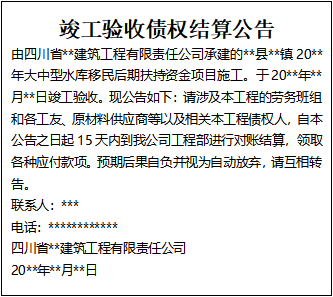 由四川省**建筑工程有限責(zé)任公司承建的**縣**鎮(zhèn)20**年大中型水庫移民后期扶持資金項(xiàng)目施工。于20**年**月**日竣工驗(yàn)收,F(xiàn)公告如下:請(qǐng)涉及本工程的勞務(wù)班組和各工友、原材料供應(yīng)商等以及相關(guān)本工程債權(quán)人,自本公告之日起15天內(nèi)到我公司工程部進(jìn)行對(duì)賬結(jié)算,領(lǐng)取各種應(yīng)付款項(xiàng)。預(yù)期后果自負(fù)并視為自動(dòng)放棄,請(qǐng)互相轉(zhuǎn)告。