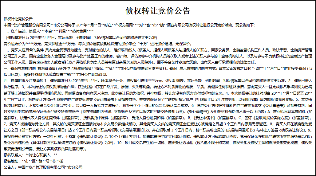 四、掛牌時(shí)限及注意事項(xiàng)1、債權(quán)基準(zhǔn)日為20**年**月**日。除本息合計(jì)外,債權(quán)墊付費(fèi)用****萬元,詳見明細(xì)表。實(shí)際金額、到期時(shí)間、擔(dān)保情況等以合同約定和法律文書為準(zhǔn)。2、債權(quán)已進(jìn)入執(zhí)行程序。3、本次轉(zhuǎn)讓的債權(quán)質(zhì)押物含白酒,存放過程中存在自然揮發(fā)、滲漏、滅失等現(xiàn)象。轉(zhuǎn)讓方不對質(zhì)押物的現(xiàn)狀、品質(zhì),真假做任何保證及承諾,意向競買人一旦完成報(bào)名手續(xù)則視為已清楚了解上述情況并自愿承擔(dān)相應(yīng)風(fēng)險(xiǎn)。同時(shí)提請各意向競買人注意,此次轉(zhuǎn)讓標(biāo)的為債權(quán),并非物權(quán),轉(zhuǎn)讓方?jīng)]有向買方交付質(zhì)押物的義務(wù)。4、本次債權(quán)轉(zhuǎn)讓的掛牌期自20**年**月**日起至20**年**月**日止,意向受讓方須在掛牌期內(nèi)向**聯(lián)交所遞交《受讓申請書》及相關(guān)材料,并交納保證金至**聯(lián)交所指定賬戶(掛牌截止日24時(shí)前到賬,以到賬為準(zhǔn))后方能取得競買資格。5、本次債權(quán)項(xiàng)目的轉(zhuǎn)讓,不接受聯(lián)合受讓和代理受讓。若只有一人報(bào)名并完成報(bào)價(jià),將補(bǔ)登7個(gè)工作日的公告后確認(rèn)是否成交。6、意向受讓方須在掛牌期內(nèi)向**聯(lián)交所遞交《受讓申請書》及相關(guān)材料,同時(shí)交納相對應(yīng)的競買保證金至**聯(lián)交所指定賬戶(須在掛牌期內(nèi)到賬,交款賬戶及方式以報(bào)名時(shí)**聯(lián)交所通知為準(zhǔn))。《受讓申請書》及相關(guān)材料包括但不限于以下內(nèi)容:A、營業(yè)執(zhí)照副本復(fù)印件(加蓋鮮章)、法定代表人身份證復(fù)印件(加蓋鮮章)、授權(quán)委托書原件(加蓋鮮章)、受托人身份證復(fù)印件(加蓋鮮章)。B、《受讓申請書》(加蓋鮮章)。C、簽訂《互聯(lián)網(wǎng)報(bào)價(jià)實(shí)施方案》(加蓋鮮章)。7、競買人被確定為受讓方后,其交納的競買保證金直接轉(zhuǎn)為本次交易價(jià)款組成部分。其他競買人交納的競買保證金在受讓方被確定之日起3個(gè)工作日內(nèi)原路無息返還。8、競買人須在被確定為受讓方之日(即**聯(lián)交所公布交易結(jié)果日)起2個(gè)工作日內(nèi)到**聯(lián)交所領(lǐng)取《交易結(jié)果通知書》,并在領(lǐng)取后3個(gè)工作日內(nèi),持**聯(lián)交所出具的《交易結(jié)果通知書》與轉(zhuǎn)讓方簽署《債權(quán)轉(zhuǎn)讓協(xié)議》。9、債權(quán)購買價(jià)款支付方式:一次性付款,于簽署《債權(quán)轉(zhuǎn)讓協(xié)議》后10個(gè)工作日內(nèi)支付。如未能按照約定支付轉(zhuǎn)讓價(jià)款,債權(quán)轉(zhuǎn)讓方可解除轉(zhuǎn)讓協(xié)議,競買保證金在扣除**聯(lián)交所交易服務(wù)費(fèi)后作為受讓方的違約金(具體付款方式以最終簽訂的《債權(quán)轉(zhuǎn)讓協(xié)議》為準(zhǔn))。10、項(xiàng)目成交后產(chǎn)生的一切稅、費(fèi)由受讓方承擔(dān)(包括但不限于印花稅、債權(quán)關(guān)系及債權(quán)主體和抵押關(guān)系變更稅費(fèi)、債權(quán)關(guān)系變更通知公告費(fèi)、受讓方實(shí)現(xiàn)債權(quán)的其他費(fèi)用等)。