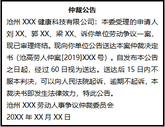 滄州XXX健康科技有限公司:本委受理的申請人劉XX、郭XX、梁XX、訴你單位勞動爭議一案,現(xiàn)已審理終結。現(xiàn)向你單位公告送達本案仲裁決定書(滄高勞人仲案[2019]XXX號)。自發(fā)布本公告之日起,經(jīng)過60日視為送達。送達后15日內(nèi)不服本判決,可以向人民法院起訴,逾期不起訴,本裁決書即發(fā)生法律效力,特此公告。