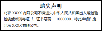 北京XXXX有限公司不慎遺失中華人民共和國(guó)出入境檢驗(yàn)檢疫熏蒸消毒證書,證書號(hào)碼:11000000,特此聲明作廢,北京XXXX有限公司。