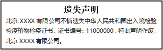 北京XXXX有限公司不慎遺失中華人民共和國出入境檢驗檢疫植物檢疫證書,證書編號:11000000,特此聲明作廢,北京XXXX有限公司。