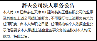 本人傅XX已辭去在天津XX建筑裝飾工程有限公司的監(jiān)事及其他在上述公司擔任的職務,不再履行與上述職務有關的任何職責,自本人辭職之日起,任何機構或個人依據企業(yè)公示信息要求本人承擔上述企業(yè)監(jiān)事義務的主張對本人均無效力,特此公告。