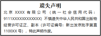 北京XXXX有限公司(統(tǒng)一社會(huì)信用代碼:9111XXXXXXXXXXXX)不慎遺失中華人民共和國(guó)出版物經(jīng)營(yíng)許可證正、副本(許可證編號(hào):新出發(fā)京批字第直1100XX號(hào)),特此聲明作廢。