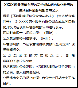 根據《環(huán)境影響評價公眾參與辦法》(生態(tài)部令第四號),對XXXX藥業(yè)股份有限公司合成車間自動化升級改造項目環(huán)境影響報告書進行公示。