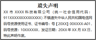 XX市XXXX科技有限公司(統一社會信用代碼:911XXXXXXXXXXXXXX)不慎遺失中華人民共和國電信網碼號資源使用證書、證書編號:號【20XX】00XXXX-A01,碼號資源:10XXXXXX,發(fā)證日期:20XX年XX月XX日,特此聲明作廢。