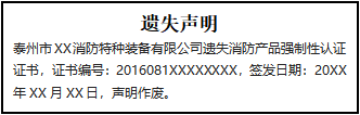泰州市XX消防特種裝備有限公司遺失消防產品強制性認證證書,證書編號:2016081XXXXXXXX,簽發(fā)日期:20XX年XX月XX日,聲明作廢。