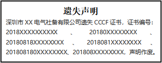 深圳市XX電氣社備有限公司遺失CCCF證書,證書編號:2018XXXXXXXXXX、20180XXXXXXXX、20180818XXXXXXXX、2018081XXXXXXXX、201808180XXXXXXXX、201808XXXXXXXX,聲明作廢。