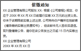 XX企業(yè)管理有限公司股東XX:根據(jù)《公司章程》規(guī)定,你應(yīng)于20XX年XX月XX日前履行實(shí)繳XX萬元的出資義務(wù)。你未于該期限前實(shí)繳上述出資,公司特向你戶籍所在地郵寄《催告繳納實(shí)繳出資通知書》,但該郵件無人簽收后退信,F(xiàn)刊登催繳公告,請(qǐng)你在該公告發(fā)出之日起15日內(nèi)實(shí)繳出資。