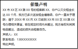 XX市XX區(qū)XX路XX號的租客韓XX,你戶以欠交租金長達XX個月,我方已多次送發(fā)租金催繳函,你戶一直未予理睬;請于20XX年XX月XX日前到XX市XX區(qū)XX路XX號辦理相關(guān)事宜,若在規(guī)定時間內(nèi)未搬出,我方有權(quán)利將其物品搬出,造成的損失由租客自負。