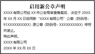 XXXX有限公司經(jīng)XX市公安局審查備案后,決定于20XX年XX月XX日啟用新“XXXX有限公司”公章(防碼號:91XXXXXXXXXX)原公章(防碼號:XXXXXXXXXX)停用并廢止。