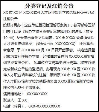 XX市XX區(qū)XXXX軟件人才職業(yè)培訓(xùn)學(xué)校選擇分類登記及注銷公告