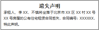 承租人、李XX,不慎將坐落于北京市XX區(qū)XX村X(qián)X號(hào)XX號(hào)房屋的公有住宅租賃合同丟失,合同編號(hào):XXXXXX,特此聲明。