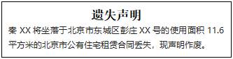 秦XX將坐落于北京市東城區(qū)彭莊XX號(hào)的使用面積11.6平方米的北京市公有住宅租賃合同丟失,現(xiàn)聲明作廢。