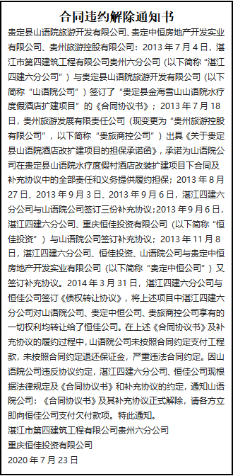 貴定縣山語院旅游開發(fā)有限公司、貴定中恒房地產開發(fā)實業(yè)有限公司、貴州旅游控股有限公司:2013年7月4日,湛江市第四建筑工程有限公司貴州六分公司(以下簡稱“湛江四建六分公司”)與貴定縣山語院旅游開發(fā)有限公司(以下簡稱“山語院公司”)簽訂了“貴定縣金海雪山山語院水療度假酒店擴建項目”的《合同協(xié)議書》;2013年7月18日,貴州旅游發(fā)展有限責任公司(現(xiàn)變更為“貴州旅游控股有限公司”,以下簡稱“貴旅商控公司”)出具《關于貴定縣山語院酒店改擴建項目的擔保承諾函》,承諾為山語院公司在貴定縣山語院水療度假村酒店改裝擴建項目下合同及補充協(xié)議中的全部責任和義務提供履約擔保;2013年8月27日、2013年9月3日、2013年9月6日,湛江四建六分公司與山語院公司簽訂三份補充協(xié)議;2013年9月6日,湛江四建六分公司、重慶恒佳投資有限公司(以下簡稱“恒佳投資”)與山語院公司簽訂補充協(xié)議;2013年11月8日,湛江四建六分公司、恒佳投資、山語院公司與貴定中恒房地產開發(fā)實業(yè)有限公司(以下簡稱“貴定中恒公司”)又簽訂補充協(xié)議。2014年3月31日,湛江四建六分公司與恒佳公司簽訂《債權轉讓協(xié)議》,將上述項目中湛江四建六分公司對山語院公司、貴定中恒公司、貴旅商控公司享有的一切權利均轉讓給了恒佳公司。在上述《合同協(xié)議書》及補充協(xié)議的履約過程中,山語院公司未按照合同約定支付工程款,未按照合同約定退還保證金,嚴重違法合同約定。因山語院公司違反協(xié)議約定,湛江四建六分公司、恒佳公司現(xiàn)根據法律規(guī)定及《合同協(xié)議書》和補充協(xié)議的約定,通知山語院公司:《合同協(xié)議書》及其補充協(xié)議正式解除,請各方立即向恒佳公司支付欠付款項。特此通知。