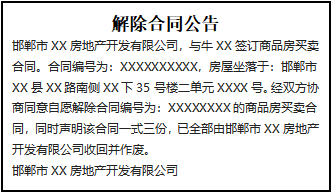 邯鄲市XX房地產(chǎn)開(kāi)發(fā)有限公司,與牛XX簽訂商品房買(mǎi)賣(mài)合同。合同編號(hào)為:XXXXXXXXXX,房屋坐落于:邯鄲市XX縣XX路南側(cè)XX下35號(hào)樓二單元XXXX號(hào)。經(jīng)雙方協(xié)商同意自愿解除合同編號(hào)為:XXXXXXXX的商品房買(mǎi)賣(mài)合同,同時(shí)聲明該合同一式三份,已全部由邯鄲市XX房地產(chǎn)開(kāi)發(fā)有限公司收回并作廢。
