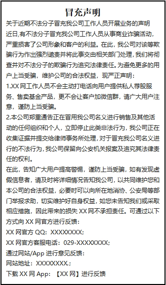 在此,告知廣大用戶提高警惕,謹(jǐn)防上當(dāng)受騙,如有發(fā)現(xiàn)虛假信息者,請及時將詳細(xì)情況告知我公司,以共同維護(hù)您和本公司的合法權(quán)益,必要時可以向所在地消協(xié)、公安局等部門舉報求助,切實維護(hù)好自身權(quán)益,如您未告知我們或采取相應(yīng)措施,因此帶來的損失XX網(wǎng)不承擔(dān)責(zé)任?赏ㄟ^以下方式向XX網(wǎng)官方進(jìn)行反饋: