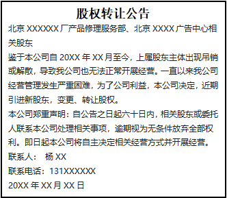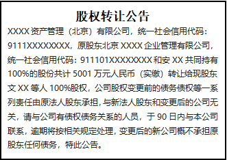 XXXX資產(chǎn)管理(北京)有限公司,統(tǒng)一社會(huì)信用代碼:9111XXXXXXXX,原股東北京XXXX企業(yè)管理有限公司,統(tǒng)一社會(huì)信用代碼:911101XXXXXXXX和安XX共同持有100%的股份共計(jì)5001萬(wàn)元人民幣(實(shí)繳)轉(zhuǎn)讓給現(xiàn)股東文XX等人100%股權(quán),公司股權(quán)變更前的債務(wù)債權(quán)等一系列責(zé)任由原法人股東承擔(dān),與新法人股東和變更后的公司無(wú)關(guān),請(qǐng)與公司有債權(quán)債務(wù)關(guān)系的人員,于90日內(nèi)與本公司聯(lián)系,逾期將按相關(guān)規(guī)定處理,變更后的新公司概不承擔(dān)原股東任何債務(wù),特此公告。