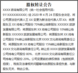 XXXX咨詢有限公司(統(tǒng)一社會(huì)信用代碼:911XXXXXXXXXX)經(jīng)2020年4月24日股東會(huì)決定,將公司原法定代表人王XX變更為新法定代表人鄧XX;將原股東王XX持有公司股份70%轉(zhuǎn)讓給新股東XXXXXX旅游發(fā)展有限公司;將原股東林XX持有公司股份10%轉(zhuǎn)讓給新股東XXXXXX旅游發(fā)展有限公司;將原股東林XX持有公司股份5%轉(zhuǎn)讓給新股東北京XXXX文化咨詢有限責(zé)任公司;將原股東林XX持有公司股份15%轉(zhuǎn)讓給新股東北京XXXX文化咨詢有限責(zé)任公司。轉(zhuǎn)讓后XXXX旅游發(fā)展有限公司持有公司股份80%,北京XXXX文化咨詢有限責(zé)任公司持有公司股份20%。公司變更前的債權(quán)債務(wù)(包括抵押、擔(dān)保)、稅務(wù)及法律相關(guān)問(wèn)題等均由原股東承擔(dān)負(fù)責(zé),與新股東無(wú)關(guān),特此公告。